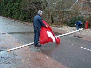 Der kom et vindstød sidst på eftermiddagen d. 9. april, som lagde vores store flagstang med flag og det hele ned over kørebanen på P. Madsensvej (ingen kom noget til).