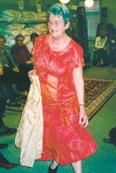 Fire friske damer fra FOA’s Efterlønsklub stillede op som mannequiner, og pÃ¥ billedet ses den ene af dem i en flot rød kjole. Modeshowet gav mange bud pÃ¥ smart sommer-tøj til bÃ¥de hverdag og fest. Arrangementet inkluderede ogsÃ¥ en let anretning foruden vin og kaffe. Der var tale om en pÃ¥ alle mÃ¥der hyggelig og vellykket aften i AJ Huset i Grenaa.