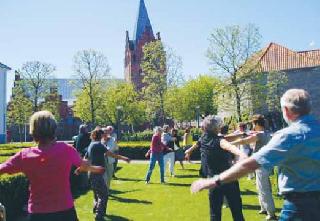 Der var dømt Sundhedsuge i Grenaa i sidste uge, og de ansatte på Social- og Arbejdsmarkedsafdelingen på Grenaa Rådhus havde fået den idé, at det ville være sundt at lave lidt middagsgymnastik i rådhushaven.