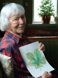 I min gamle have har jeg et stort kastanietræ. Det inspirerede mig, da jeg gik tur i naturen og rundt ved fjorden. Norddjurslændingene er ”Kystens Folk”. Det handler om sammenhold og dybde. Jeg malede det allerede i efterÃ¥ret 2005. De syv smÃ¥ blade med stærke farver symboliserer de største byer, de syv store kronblade fortæller om udstrækningen af smÃ¥byer og landsbyerne, mens de helt smÃ¥, friskgrønne pletter pÃ¥ bladene fortæller om tilstedeværelsen af smÃ¥husene helt ud til kysten i den nye kommune og livskraften hos kystens folk, forklarer Gerda Høeg, 93 Ã¥r gammel.