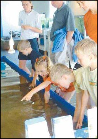 Men børnene - og for den sags skyld ogsÃ¥ de voksne – interesserer sig mere for et stort, lavvandet bassin med sandbund. Ulke, tunger, rødspætter, skrubber, karusser og søstjerner gemmer sig i bassinet. NÃ¥r børnene pludselig opdager et af havdyrene, bliver havet pludselig levende, overraskende og spændende.