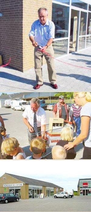 Entreprenørfirmaet Skanska stod for opførelsen af dette butikstorv, mens SuperBrugsen / Glesborg Brugsforening stod bag økonomien i projektet. Noget, som SuperBrugsen fik meget ros for, da Nørre Djurs Kommunes daværende borgmester, Jens Peter Jellesen (V), holdt indvielsestalen for et år siden. Det ene af billederne foreviger det snoreklip, som han også foretog på indvielses-dagen. Et andet foto viser samme dags uddeling af slik til de mange fremmødte børn. Noget, som SuperBrugsens mangeårige uddeler, Per Pedersen, stod for. Men tilbage til borgmesterens roser: