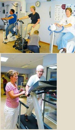 [billede nederst] Fysioterapeut Helle Therkildsen og én af deltagerne ses her ved det løbe/gåbånd, som har været flittigt benyttet i hele projektperioden. [billede øverst] Motionscyklerne i træningssalen er blevet brugt til at træne og til at måle kondition på.