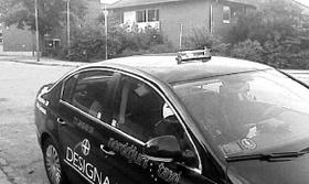 Taxien fra Norddjurs Taxi med det ødelagte tagskilt. Ejeren af Norddjurs Taxi har set, at en chauffør fra Grenaa Taxa har begået hærværket.