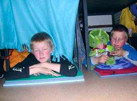 To trætte Fornæs-ulveunger, Anton og Martin, er vist grydeklar til overnatningen i deres respektive »ulvehuler«.
