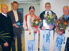 Fra venstre ses Nordea’s filialdirektør Ole K. Andersen og formanden for BankrÃ¥det, Claus Wistoft, der i sidste uge uddelte fritidspriser til Kjeld Jørgensen (Grenaa Skyttekreds), Brian Siig (GIF HÃ¥ndbold) og til Jakob Olesen (I. F. Midtdjurs).