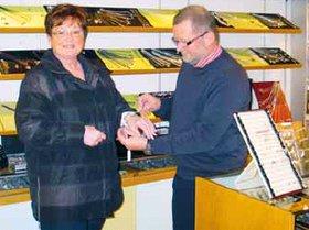 Den heldige vinder blev fundet i sidste uge, og på billedet er indehaveren af Mouritsens Eftf. i Grenaa, Bent Bjerg Madsen, i færd med at montere den flotte præmie - et Obaku V110 dame-ur - på vinderens håndled. Og den heldige vinder af konkurrencen hedder Grete Jensen. Hun bor på Sandbakkevej i Grenaa. V110-uret er et super-feminint ur - et rigtigt smykkeur med fokus på de lange, tynde linier. Time-markeringen er diskret, og detaljen på kronen fremhæver det femine og sofisktikerede udtryk.