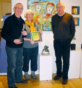 De lokale kunstnere Kirsten og Mogens Mønsted udstiller her i februar måned et bredt udsnit af deres værker hos Profil i Lillegade i Grenaa. Yderst til højre ses endvidere indehaveren af Profil Optik, optiker Mogens Pedersen.