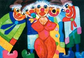 Cirkusklovnen er en gennemgående figur i Mette Harbos farvestrålende og frodige billedunivers. I denne måned kan hendes billeder ses i Djurslands Bank i Grenaa.
