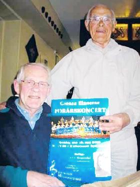 Plakaten til Grenaa Blæsernes forårskoncert vises frem af Henning Stoffer og Aksel Frandsen.