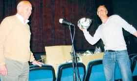 Henning Enoksen og Flemming Povlsen diskede op med fodbold-historier og uddelte fodbolde i Grenaa Kino onsdag aften i sidste uge. Anledningen var snigpremieren på fodbold-filmen »Og det var Danmark«.