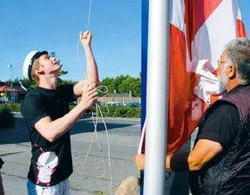 Årets første student på Grenaa Tekniske Skole blev udklækket allerede onsdag i sidste uge. Han hedder Kasper Skov Christensen og er fra Ebeltoft. Her er han i fuld sving med den traditionelle flag-hejsning.