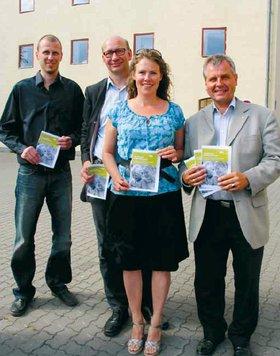 VIA University College i Grenaa kan fra og med september tilbyde den ordinære pædagoguddannelse. Fra venstre ses VIA-folkene Verner Becker, Erik Hygum og Mette Lund samt viceborgmester i Norddjurs Kommune, Niels Erik Iversen. I hænderne har de den brochure, der fortæller nærmere om det nye uddannelsestilbud i Grenaa.