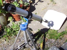 Efter et forgæves forsøg med at tage et billede med kameraet igennem et solfilter, blev den gammle stjernekikkert hentet fra loftet og brugt som projektør. (Man må ALDRIG kigge direkte på solen med en kikkert).