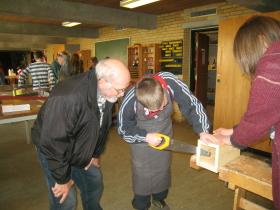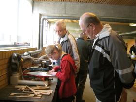 vend Ã…ge Hjort Pedersen, yderst til højre, (73 Ã¥r) bor i Ørsted og er glad for projekt “Netværk for mænd”. I april var han og et par andre ældre mænd pÃ¥ besøg pÃ¥ Rougsø Skoles træværksted. Her var børnene i fuld gang med arbejdet, og de fik et par gode rÃ¥d med pÃ¥ vejen af de erfarne mænd.