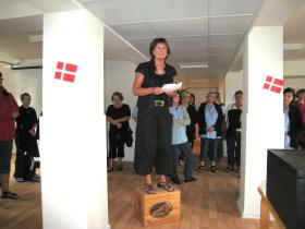 Op på ølkassen. Ninna Thomsen, leder af Hjemmepleje Øst, opfordrede i sin tale medarbejderne til at give hinanden et skulderklap for den store indsats, som alle har ydet i forbindelse med flytningen til de nye lokaler.
