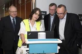 Superbruger på Regionshospitalet Randers, Helle Moesgaard Odby (gul vest) demonstrerer en stuegangs-model af den fulde EPJ-Columna for (fra venstre): cheflæge Morten Noreng, regionsdirektør Bo Johansen og regionsrådsformand Bent Hansen (S) (Foto: Region Midt)