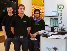 Fra venstre står Nikolaj Grant, Johnny Oliveira Møller og Rameez Hassan Syed, de tre direktører for GreenDomestica, ved deres stand i Odense.( Foto: En venlig forbipasserende)