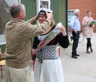 En tydeligt rørt Mona Venø Simonsen får af sin far sat studenterhuen på hovedet. I baggrunden står hendes lærer og eksaminator Frank Holevang og taler med Christine Kroer Nielsen, der var i gruppe med Mona og ligesom Mona fik karakteren 12.