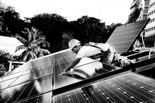 Maldivernes præsident, Mohamed Nasheed, tog i går forskud på den internationale klima-kampagne ved egenhændigt at kravle op på taget af præsidentboligen og installere solpaneler. Foto: Mohamed Ali/Flickr