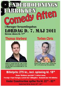 Thomas Warberg og Torben Chris åbner dørene i Nørager forsamlingshus, og vil her byde på Stand Up i højeste klasse. Inden er der 3 retter mad og der efter kan man lytte og danse til "Under Constrcution".