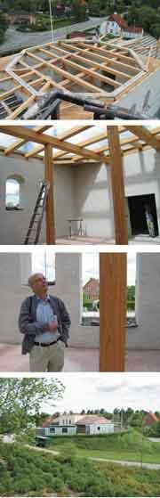 Møllekrop, møllehat og møllevinger forventer man at kunne sejle til Grenaa i august-september, så ovenpå indeværende uges arbejder sker der altså et midlertidigt stop i genopbygningen af Baunhøj Mølle på toppen af Baunhøj. Samtidig overdækkes en stor del af det nuværende byggeri af, så sommerens nedbør ikke samler sig på undermøllens gulv. Derfor er herstående fotos af møllebyggeriet - taget i sidste uge - helt unikke, idet man kan se konstruktionen ved etageadskillelsen mellem møllekroppen og undermøllen.