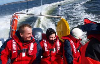 Fjordcentret har fået en stor gummibåd (RIB), med plads til 12 personer. Der er 2 styrmænd ombord, og de giver gæsterne en tur på fjorden. Vi sejler stille og roligt vest om kanalen og derefter bliver der lukket op for hestekræfterne.
