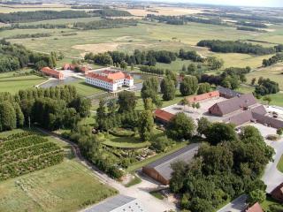 Clausholm Avlsgård med slot og park i baggrunden.
