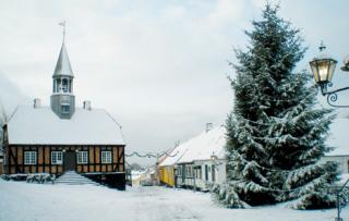 Ebeltoft Raadhus vinterklædt.