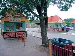 I højsæsonen og på dage med godt besøg er billethuset til venstre åbent for gående og cyklende trafik med billetering i luger på begge sider af huset. Når trafikken senere på dagen stilner af, bliver gående henvist til de åbne luger blandt Djurs Sommerlands fire øvrige billethuse for enden af bilernes opmarchsbåse, som det fremgår af billedet.