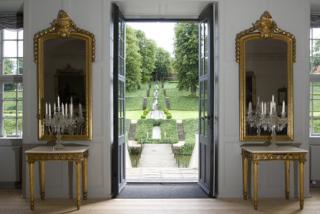 Et kig ud i parken fra en af Clausholm Slots havedøre.