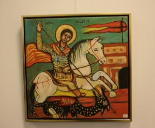 Udstillingens tema er "MØDET MELLEM HIMMEL OG JORD". Udstillingen omfatter akvareller, collager og mosaikker. Jette Holm, Århus, har været sognepræst og forskningsassistent ved Center for Grundtvigs studier og har i mere end 30 år malet som hobby.