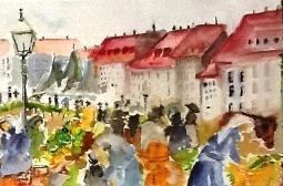 Akvarel af Ida Marie Duus Peitersen med stemning fra Gammel Strand i København.