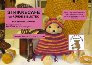 Teddy Shop Danmark afholder disse strikkecafé for bÃ¥de børn, unge, voksne og ældre, - sÃ¥vel nybegyndere som øvede. FormÃ¥let er at dele inspiration og strikkeglæde. Strikkesæsonen er over os og igen kommer der gang i strikkepindene. Kom og strik. Du kan fÃ¥ masser af inspiration og vejledning. Hyg dig med de andre ”strikker”. - Vi serverer kaffe, saftevand og kage, og der er gratis garn og pinde til børnene.
