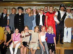 Tante Sofie i skrapt rødt dress fik Kaptajn Klo med fuldskæg og sørøverhat i Tove Mogensens fusionsstykke på Marienhoffskolen. Her omgivet af hele skaren af medvirkende i stykket.
