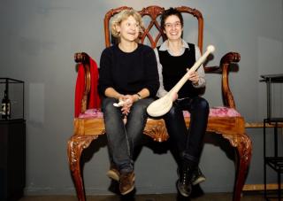 Museumsinspektør Hanne Schaumburg Sørensen har lavet udstillingen "Skal vi lege?". Her er hun krøbet op i tronstolen sammen med museumsinspektør Karen Buch Dubery. Foto: Richard Sylvestersen.