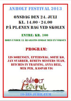 Anholt Festivalen fejrer i år 10-års jubilæum med et stort program og mange overraskelser. Der vil være flere kendte bands fra hele landet. Det er musik og underholdning for hele familien: Lis Sørensen, Eftersmag, Sofie KØ, Jan Svarrer, Rimets Mesters Team, Bitches in training, Anna Bell, Mek Pek, Kaspar Vig.