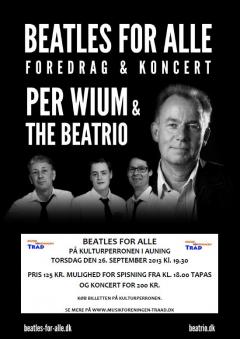 Kom til en spændende aften som hylder The Beatles og deres musik. Per Wium holder foredrag om The Beatles og deres musik. Han har skrevet en bog der beskriver deres musik og behandler sangskrivningens udvikling hos bandet, samt deres særlige vokal-arrangementer og det konkurrerende partnerskab mellem Lennon og McCartney. - Desuden gæstes arrangementet af The Beatrio, som spiller noget af The Beatles´ musik med stor kærlighed til vokalarrangementer og lyden fra 60´erne. Der er mulighed for at deltage i arrangement med eller uden spisning.