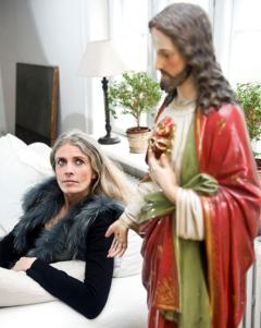 Iben Thranholm ved en skulptur af Jesus.