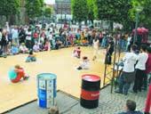 Unge fra flere europæiske nationer opførte onsdag og torsdag i sidste uge æstetiske Street Art-opvisninger. Blandt andet på Torvet i Grenaa, hvor disse to billeder er taget - men gruppen af unge nåede også omkring Bønnerup Havn og Grenaa Havn.