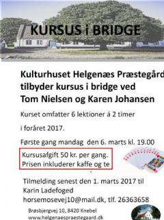 Kursus i bridge i Kulturhuset Helgenæs Præstegård første gang mandag d. 6. marts 2017 , kl. 19-21