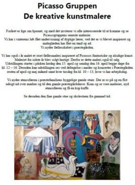 Picasso Gruppen, de kreative kunstmalere på Helgenæs, udstiller deres seneste malerier. Gruppen har i vinterens løb fået undervisning af en dygtig lærer, som har inspireret og styrket maleglæden. De har også i år malet et stort fællesmaleri inspireret af Picassos fantastiske og alsidige kunst. Maleriet fra sidst år blev hurtigt solgt. Derfor er dette maleri også til salg. Udstillingen startede i påsken lørdag den 15. april og og slutter søndag den 16. april. Begge dage er det fra kl. 12 til 16. Desuden kan udstillingen ses ved deltagelse i møder og koncerter i Kulturhuset i resten af april og maj måned, samt hver tirsdag fra kl. 10 -13, hvor Picassogruppen har arbejdsdag. Der er fri entré.
