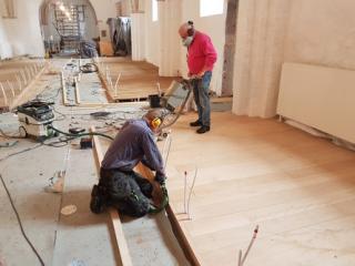 Egetræsgulvene er nu lagt i Ørsted Kirke.