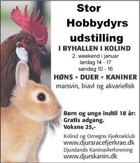 Hobbydyrsudstilling i Byhallen i Kolind lørdag og søndag d. 13+14/1 hhv. kl. 14 og kl. 10 til 16