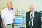 grenaa bladet: Fredag den 10. september blev der indviet en datastue i kælderen til Ældrecentret Posthaven i Grenaa. På billedet ses to af initiativtagerne, Svend Nielsen og Leif Ryttertoft, ved en af computerne.