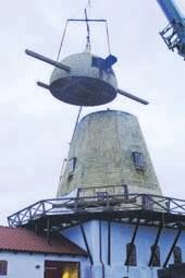 Mange grenaaensere fulgte interesseret med, da arbejdet med at løfte den tonstunge møllehat på plads på den 35 tons tunge møllekrop onsdag eftermiddag i sidste uge. Det tog en times tid at få de to mølle-dele til at falde i hak. Og nok så vigtigt: De to dele passede sammen!