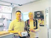 Ella Nielsen Blev den heldige vinder. I onsdags fik hun en mobiltelefon overragt af butikschef Martin Highland.