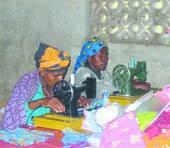 Her ses to af masai-landsbyens sypiger i aktion. Stedet er Enkutuk Oiti i Tanzania, som i øjeblikket har besøg af et hold elever og lærere fra Grenaa Produktionsskole.