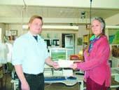På billedet ses Jan Sørensen fra Anholt Tuborg og Carlsberg Depot, som overrækker bevillingen til Turistforeningens daglige leder, Agnethe Nørgaard.