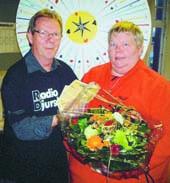 På billedet overrækker bingoværten Poul Elo Bach gavekort og blomster til den første bingovinder, Marianne Juul Pedersen fra Grenaa. Blomsterne er forøvrigt sponsoreret af Anemone Blomster i Grenaa.